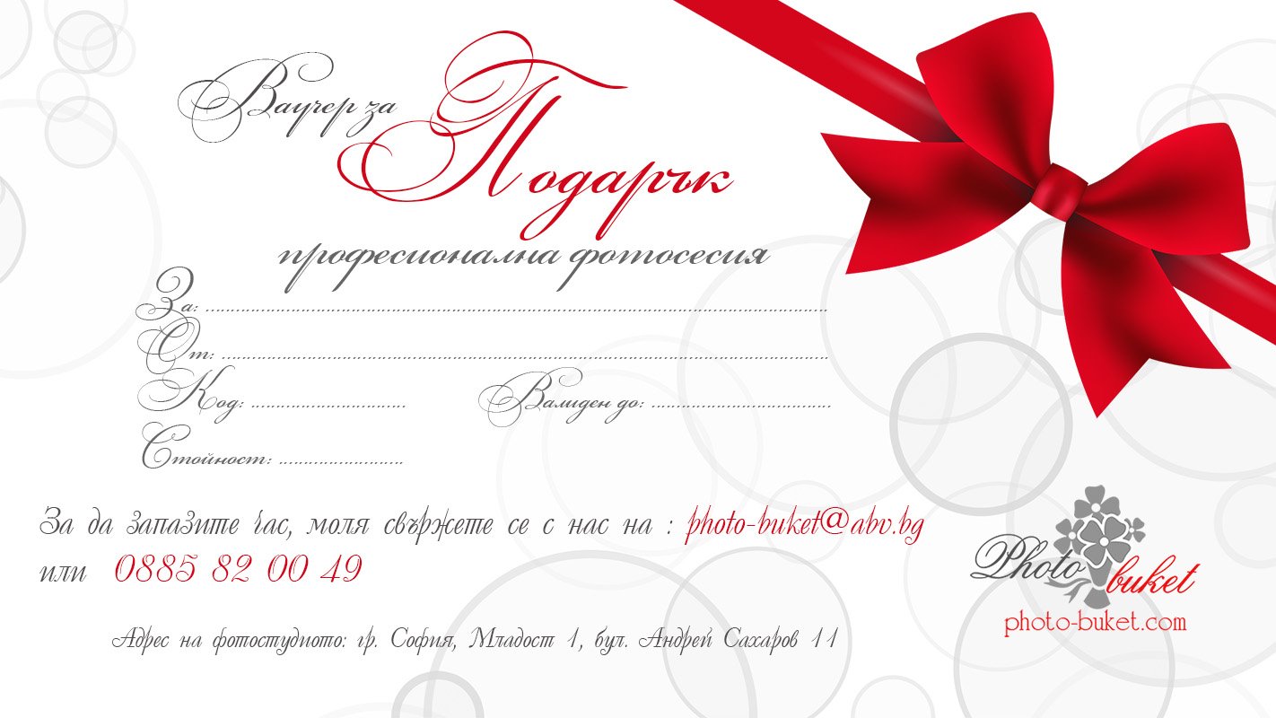 За закупуване на ваучер, моля обадете се на тел. 0885 82 00 49 , имейл: photo-buket@abv.bg или по Вайбър!